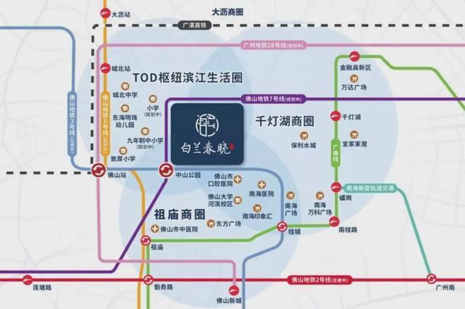 中交·白兰春晓地处佛山禅城区核芯位置,位于祖庙商圈与千灯湖商圈交汇的几何中轴线上,是广佛交界的黄金走廊,更是城市两大顶级商圈辐射的重要节点。该项目坐拥禅桂交界的战略枢纽,10分钟即可畅达祖庙商圈与千灯湖商圈,尽享两大商圈一站式高端商业配套与生活资源,涵盖金融办公、购物中心、休闲餐饮、文化展演等多元功能。5分钟生活圈内直达东方广场,轻松实现吃、喝、玩、乐、购等多项生活所需,让生活的每一个细节都被悉心照顾。项目周边同时规划多块商业用地,未来将崛起新一代高端服务商业片区,为区域注入更强劲的产业动能与人居价值。